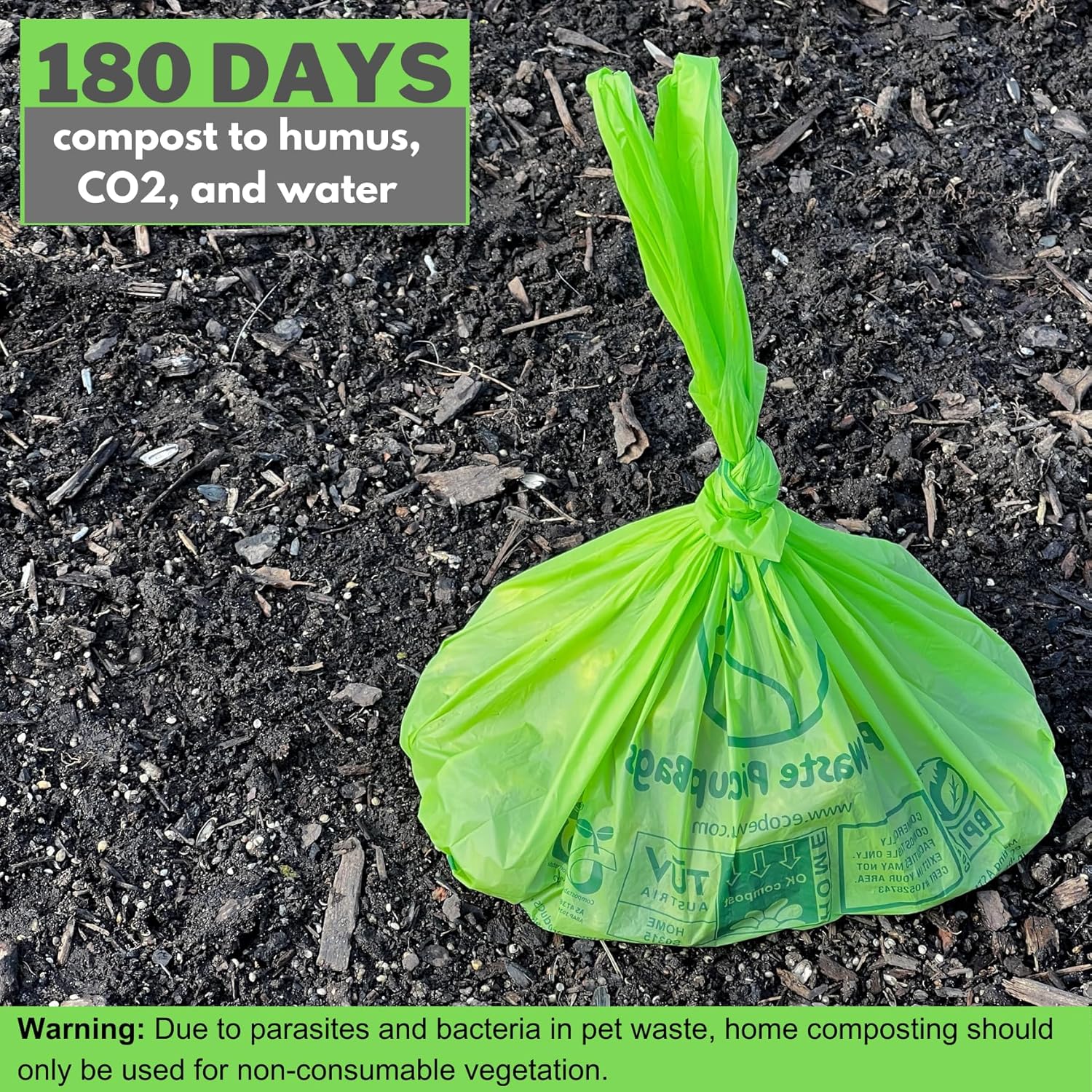 - ⏰ 180 DAYS: ecobewus compost bags will degrade to humus, carbon dioxide (CO2) and water within 180 days when placed in a standard compose pile